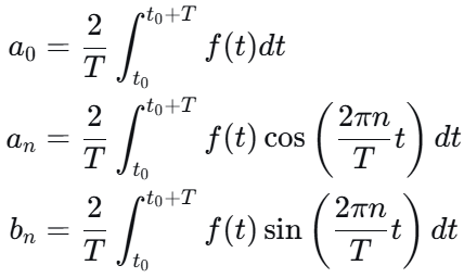 其中a0,a1,a2,...,an,b1,b2,...,bn的值可以通过图中的公式计算,t0可以取任意时刻,只要保证是完整的T区间即可。这里为方便可以取t0=0。为什么可以这样计算每个系数呢?核心思想就是利用了正交性。