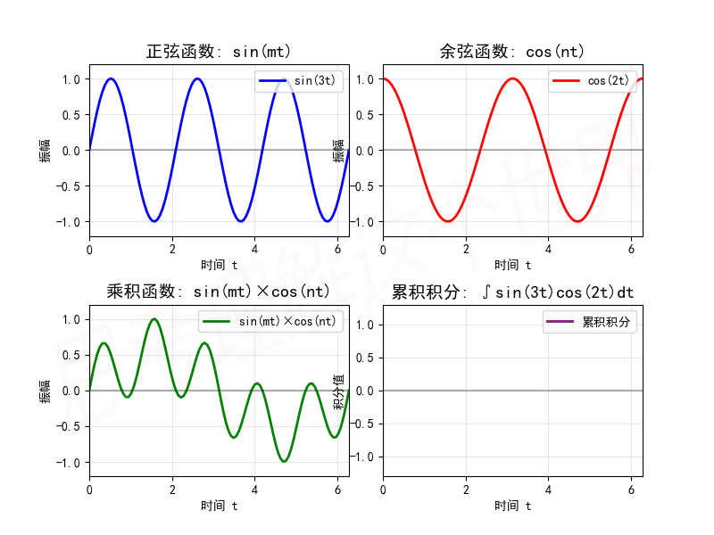 那正交性怎么理解呢?下图中sin(3t)和cos(2t)两个函数,他们相乘后在周期范围内进行积分,最终的积分结果为0。可以看到因为有些积分为正有些积分为负,所以最终结果为0。两个函数相乘积分结果为0就是正交性,利用这个特性就能得到傅里叶系数的计算公式。