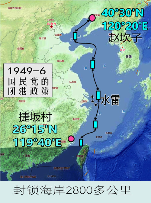 1949年6月25日国民党《中央日报》公告 ,台湾国民党当局规定封锁的海区是:闽江口北到辽河口,具体北纬26度15分,东经119度40分;北纬40度30分,东经122度20分。