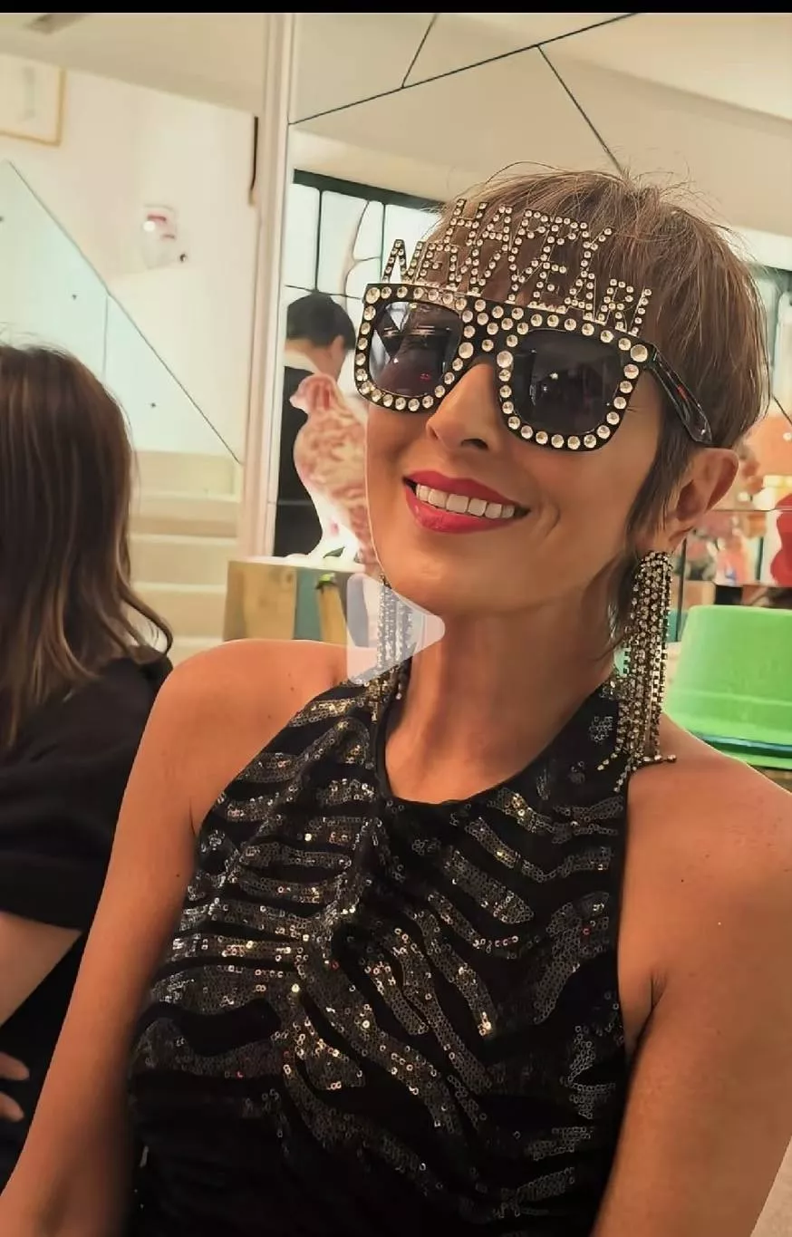 好朋友上山诗纳自然不会缺席,她穿着黑色亮闪闪的挂壁礼服,戴着镶钻的黑色墨镜,上面还有Happy newyear的字样,与流苏耳坠形成呼应,美得明媚大气。短发姐姐真的超有气质。