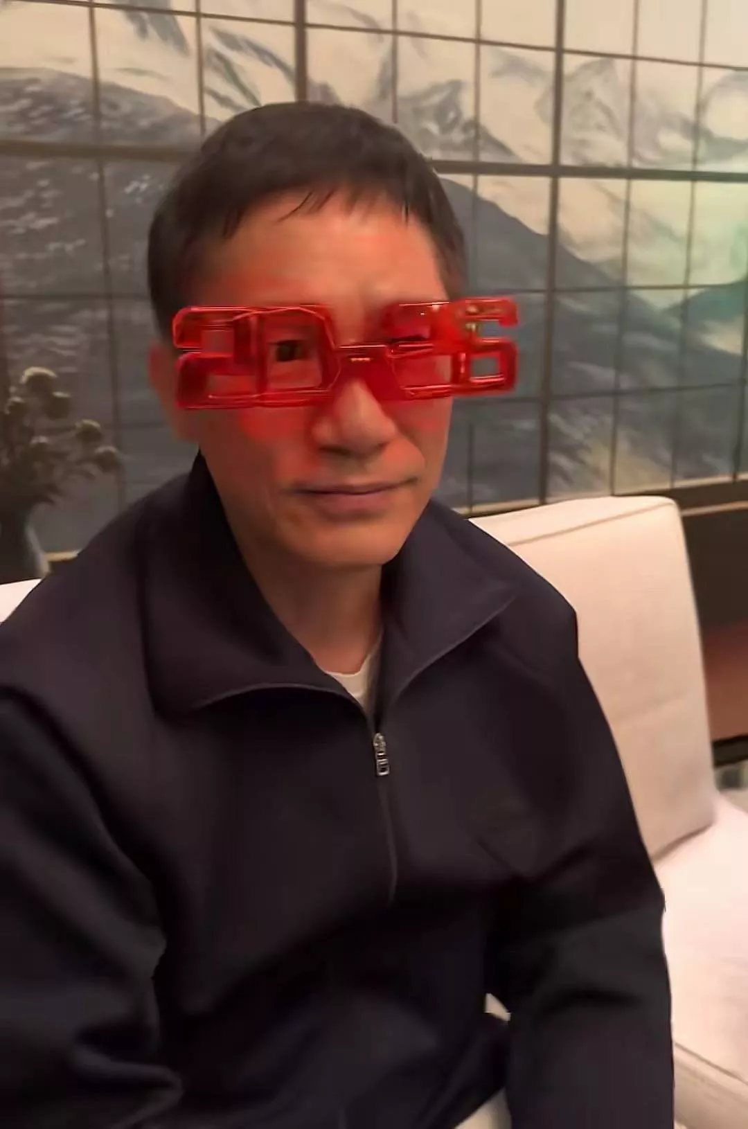 被戴上跨年眼镜的梁朝伟,嘴角勉强挤出一丝微笑,这个画面真是太搞笑了。