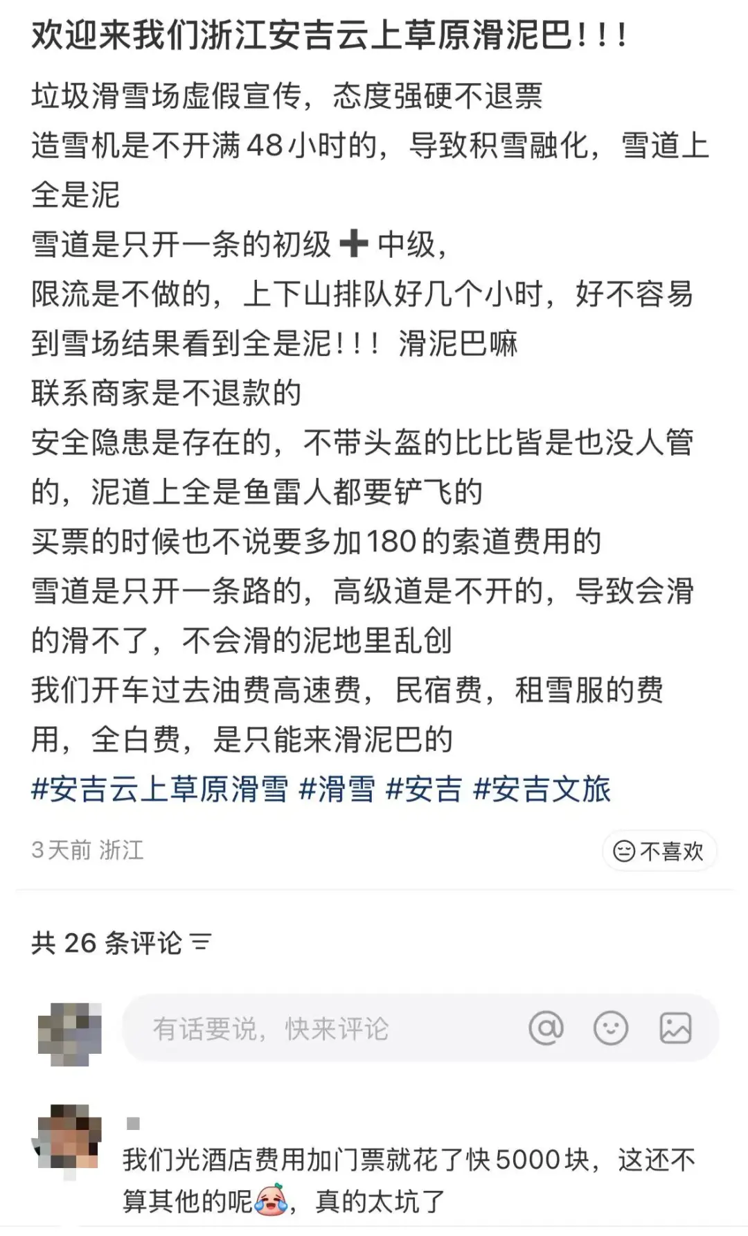 一网友表示,自己花了5000块订酒店、买门票,到了才发现是滑泥巴。(图/小红书截图)