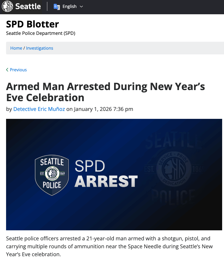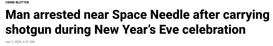 据1月1日报道,新年夜庆祝活动期间,西雅图警方于太空针塔(Space Needle)附近逮捕了一名21岁的男子,该名男子持有霰弹枪和手枪。