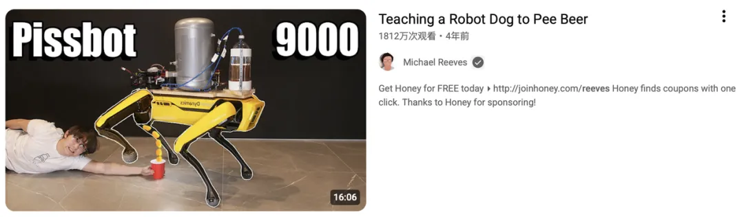 一位叫 Michael Reeves 的博主,他改装波士顿动力的机器狗,编写了一套视觉识别代码。让机器狗识别出地上的红杯子,精准地往杯子里撒尿(啤酒),虽然准头只有35%......
