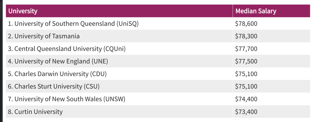 - 南昆士兰大学(University of Southern Queensland)以78,600澳元的中位薪资位居全国第一