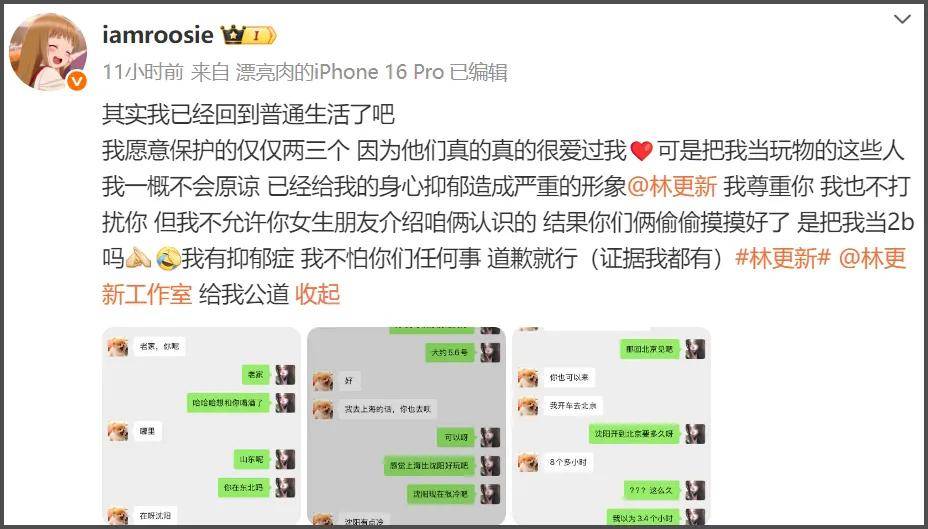 司晓迪先是发文喊话林更新要公道,怒斥林更新把她当玩物,晒出多张聊天记录证明两人熟识,林更新不仅给她拜年,还一直要请她吃饭,约她去北京。
