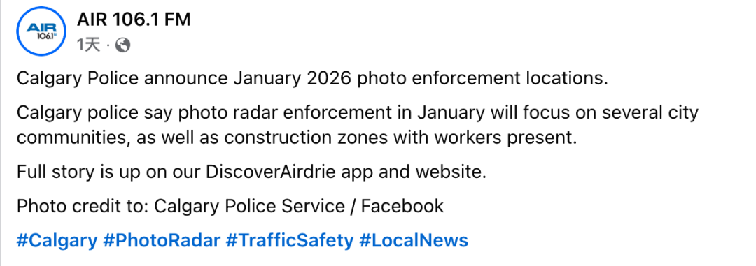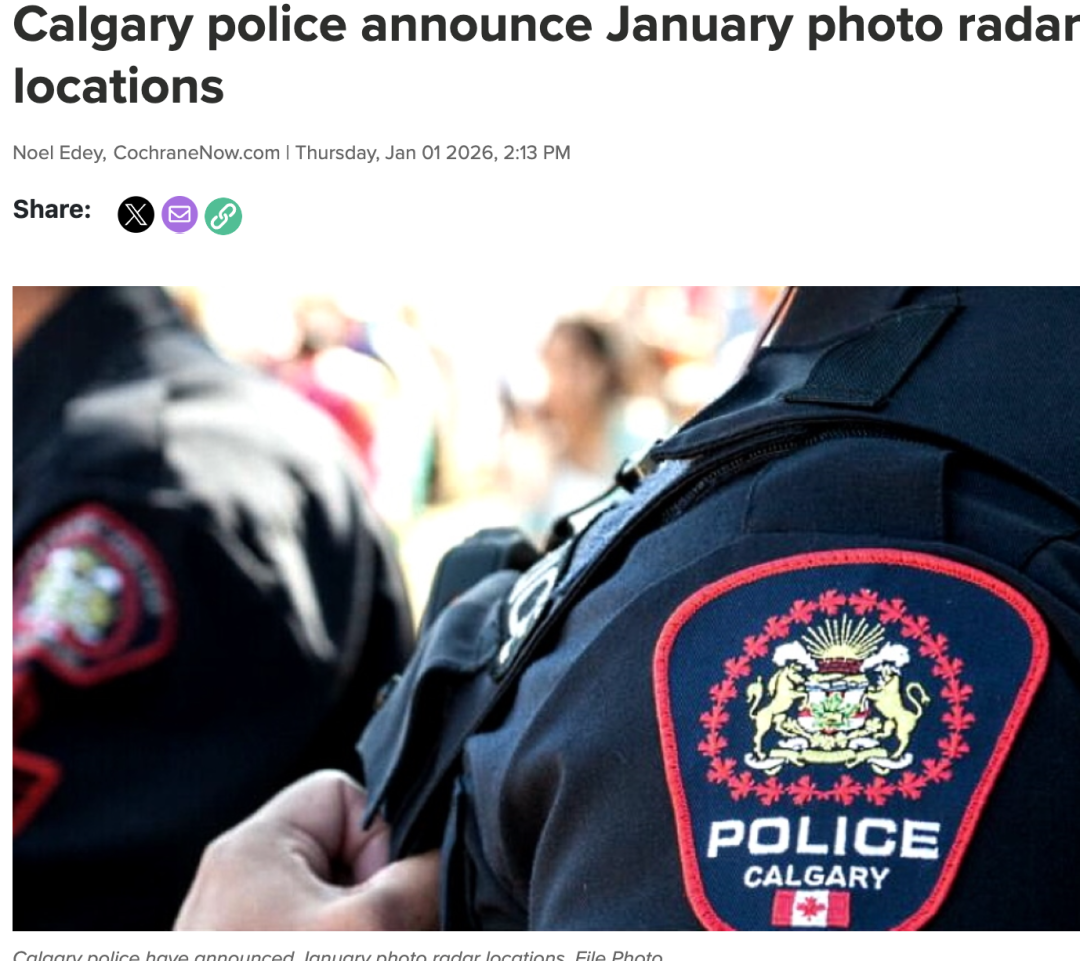 卡尔加里警方近日宣布,2026年1月份的移动照相雷达(Mobile Photo Radar)执法重点区域已经确定,驾驶者务必提高警惕,遵守限速规定,避免罚款甚至上法庭。此次执法不仅覆盖多个社区,还包括施工区,只要现场有工作人员,照相执法车辆就可能出现。