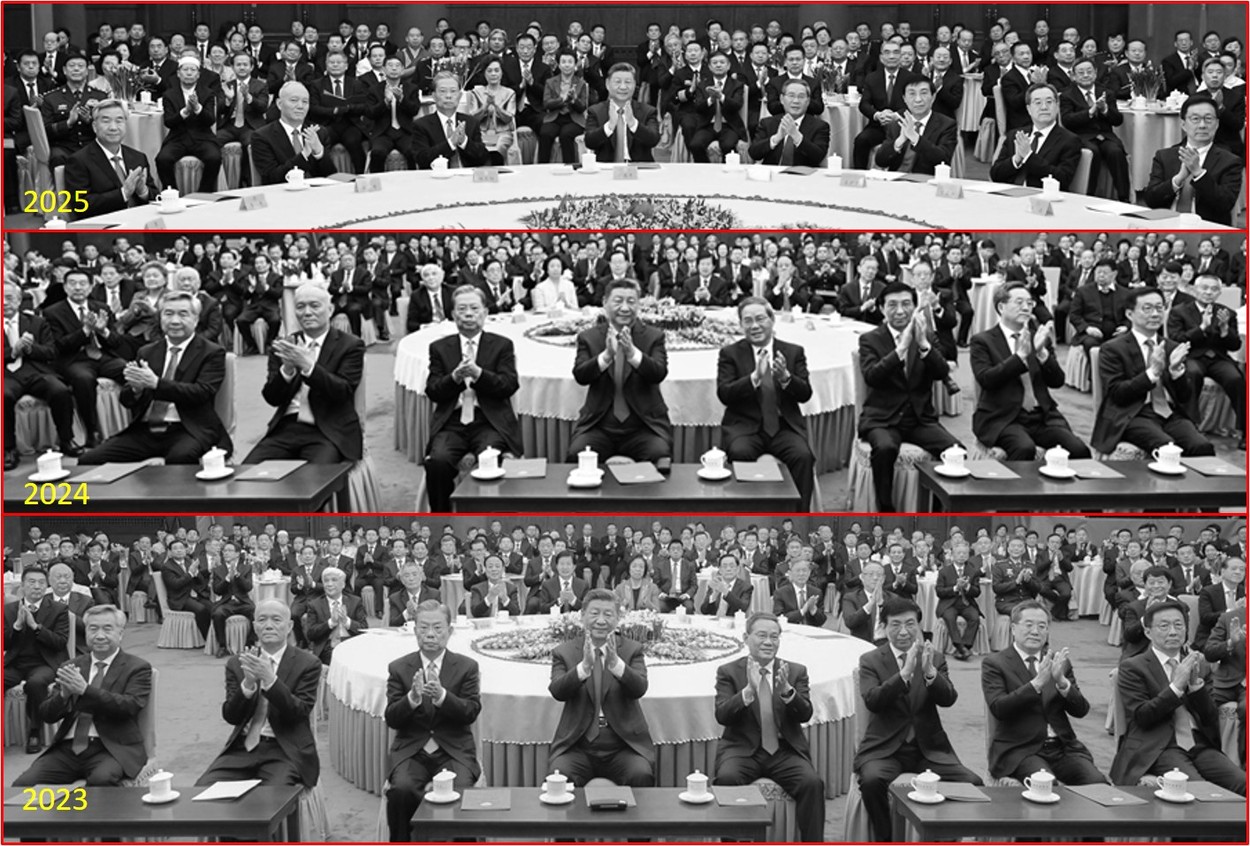 但2025年茶话会,未再按惯例添加三张条形桌;习近平与其他人一样坐在大圆桌上观看演出。新华社报道中配图也改为大圆桌合照。