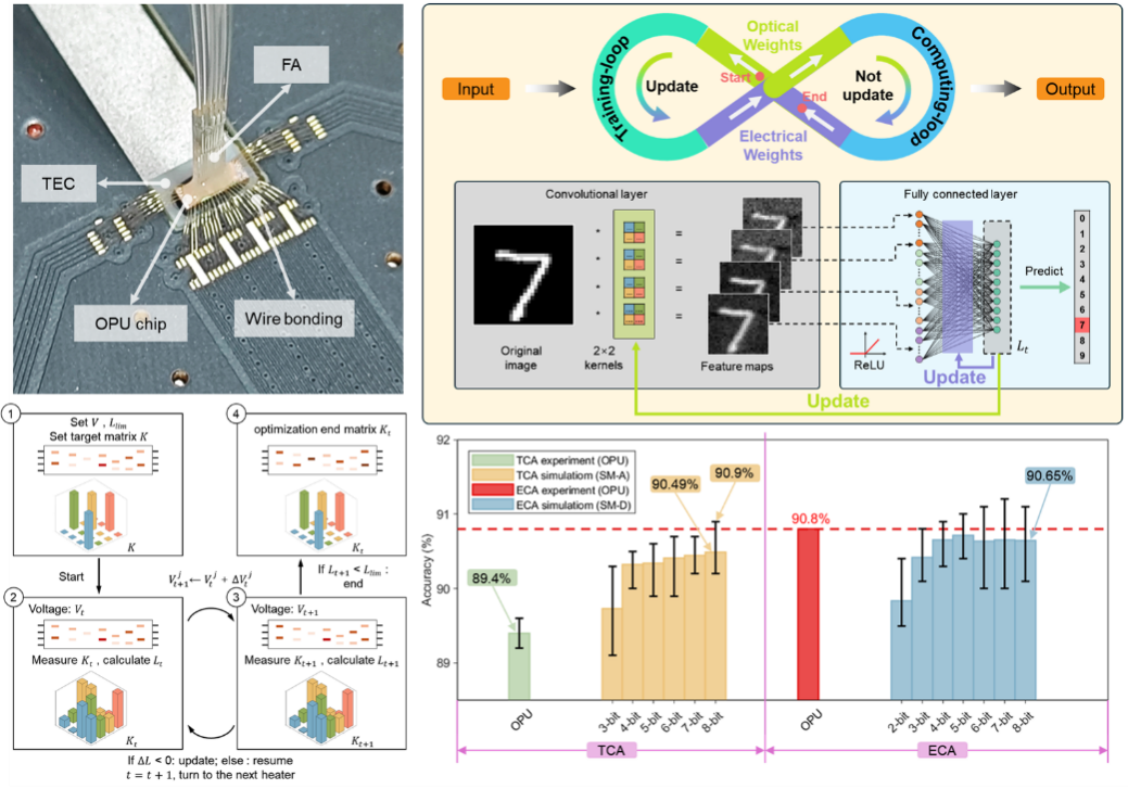 中国科学院半导体研究所李明研究员团队提出了一种基于相位像素阵列的可编程光学处理单元(OPU),并结合李雅普诺夫稳定性理论实现了对OPU的灵活编程。在此基础上,该团队构建了一种端到端闭环光电混合计算架构(ECA),通过硬件—算法协同设计,实现了训练与推理的全流程闭环优化,有效补偿了信息熵损失,打破了光计算中计算精度与准确度之间的强耦合关系。