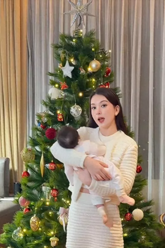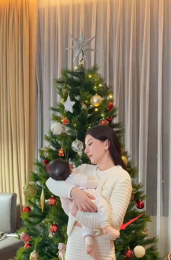 画面里她身穿白色针织套裙,站在圣诞树前,身材纤细得完全不像刚生完孩子两个月的人。