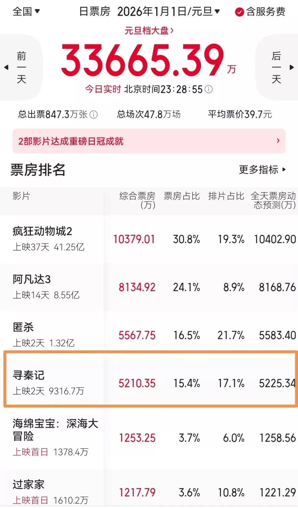 冠军为《疯狂动物城2》,元旦当日票房再爆1亿,内地总票房已破41亿,《复联4》内地42.5亿引进片票房纪录,势在必得了,这部动画实现了票房长线大卖。