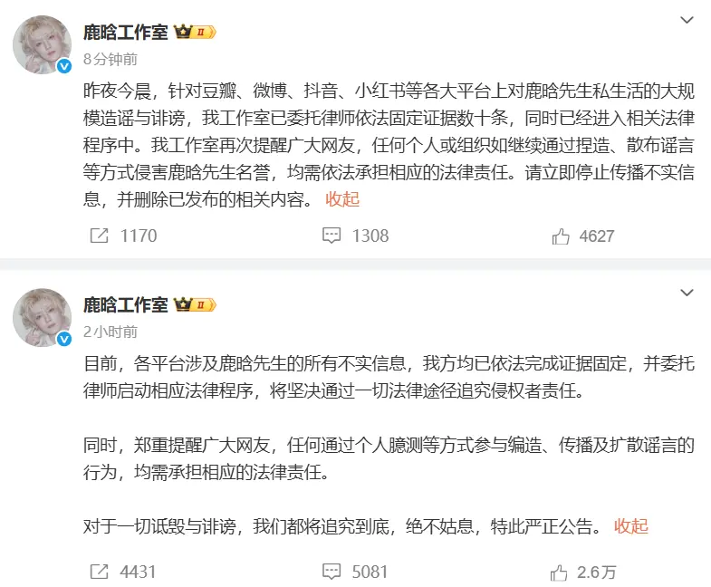 鹿晗工作室凌晨连发两条回应,称对于鹿晗私生活的大规模造谣与诽谤已固定证据并进入法律程序,呼吁网友停止传播不实信息,并删除已发布的相关内容。