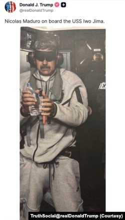 特朗普总统在社交媒体公布的被捉后的马杜罗在美国海军“硫磺岛”号两栖攻击舰上的照片。