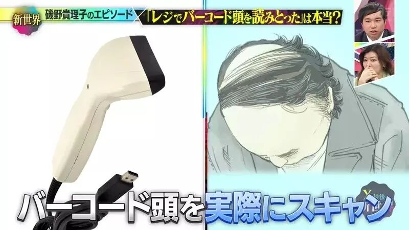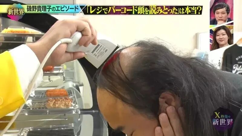两人几撮稀疏的头发,像条码一样覆盖。主持人高野正成尝试用扫码枪扫扫看两人的头顶,但反复扫描都未能成功。