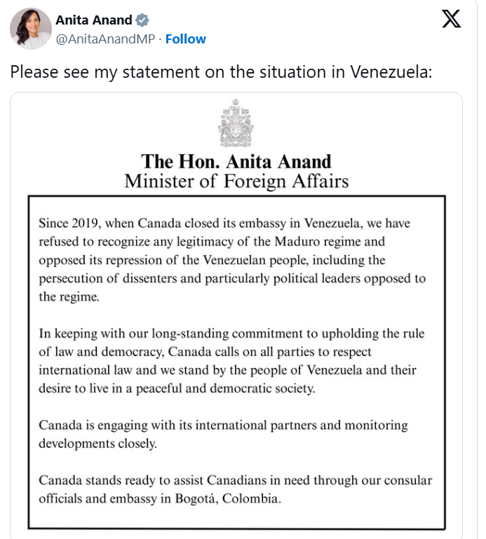她在X上发文称:“为了坚持我们长期以来维护法治和民主的承诺,加拿大呼吁各方遵守国际法,并支持委内瑞拉人民追求和平与民主社会的愿望。”