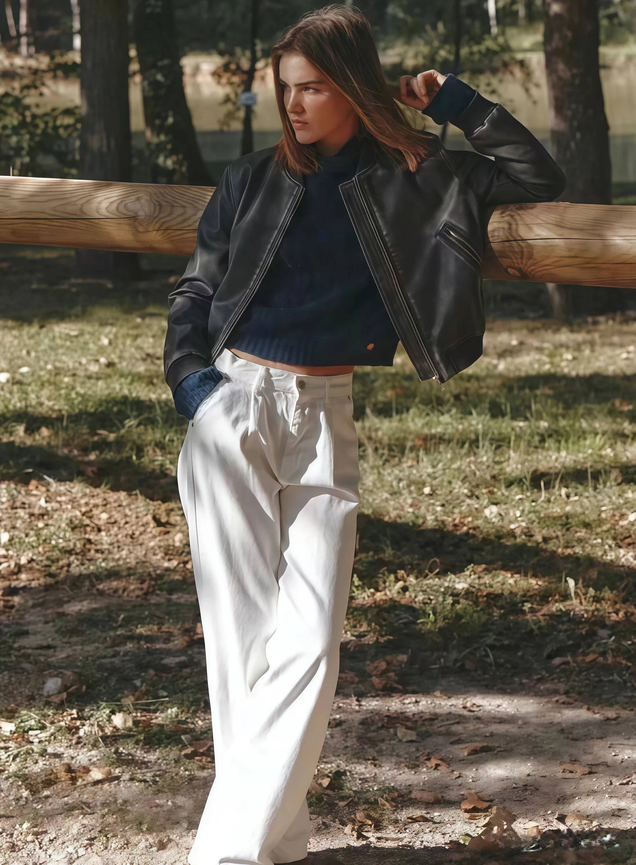 皮夹克+白裤子,帅气和柔美的新鲜碰撞