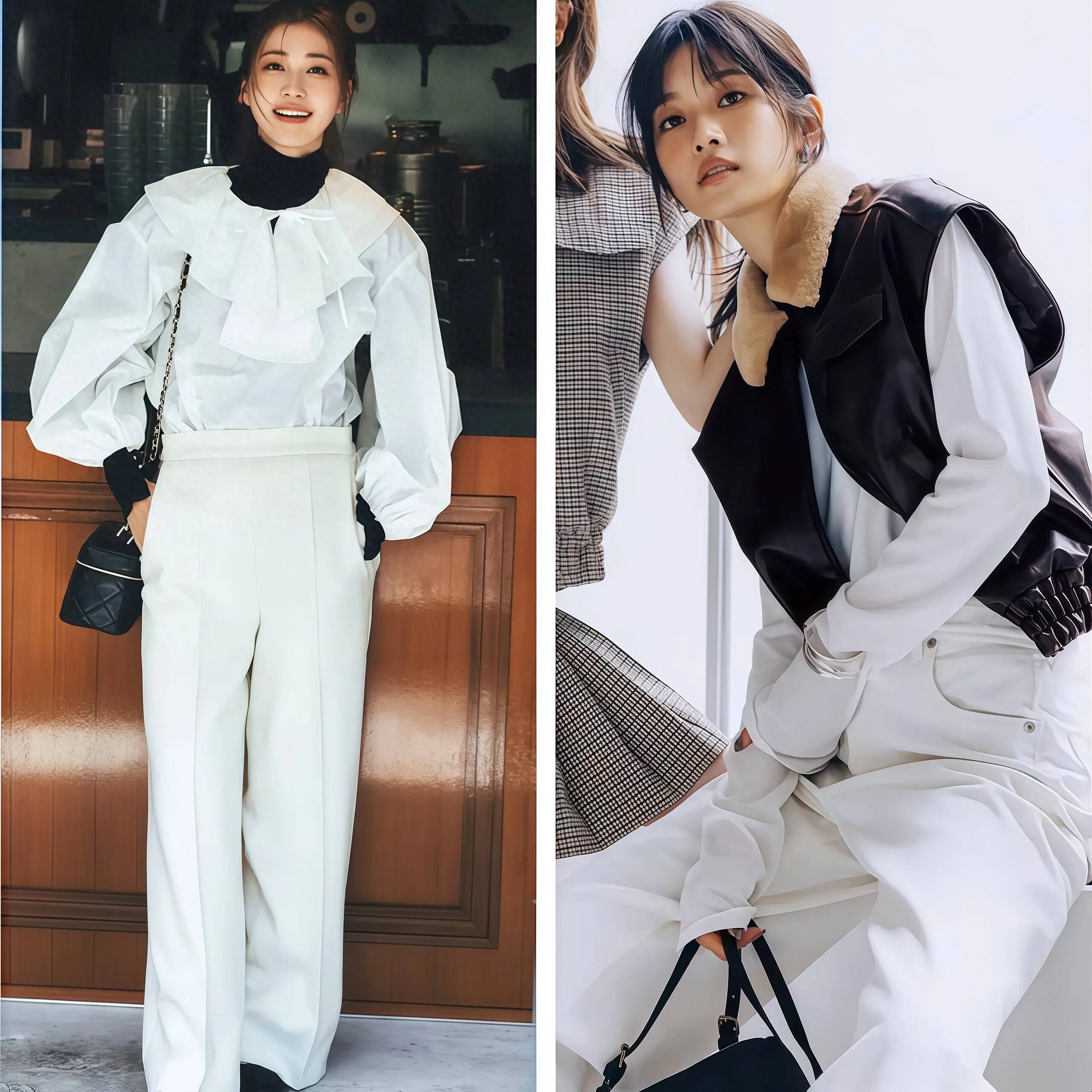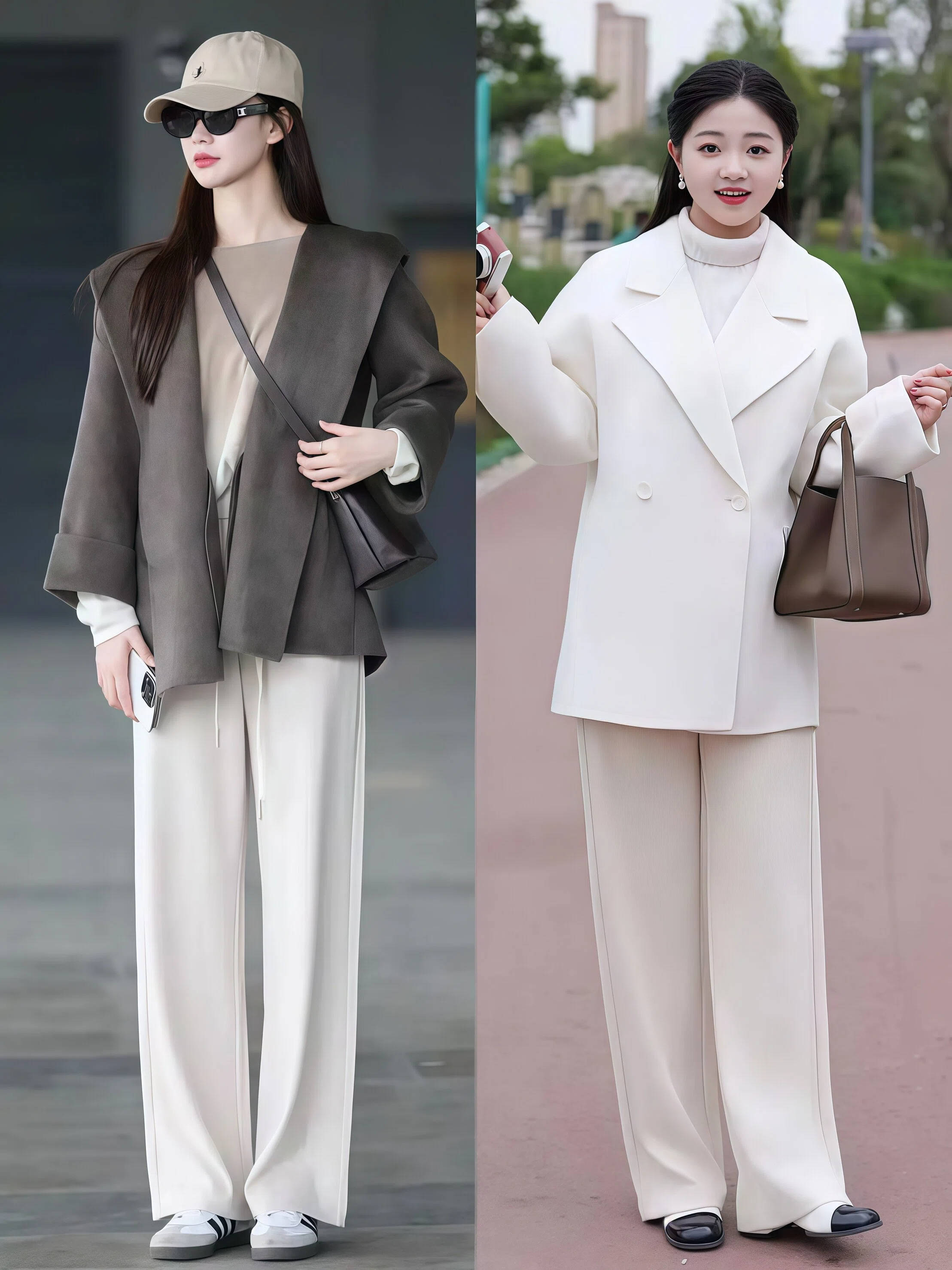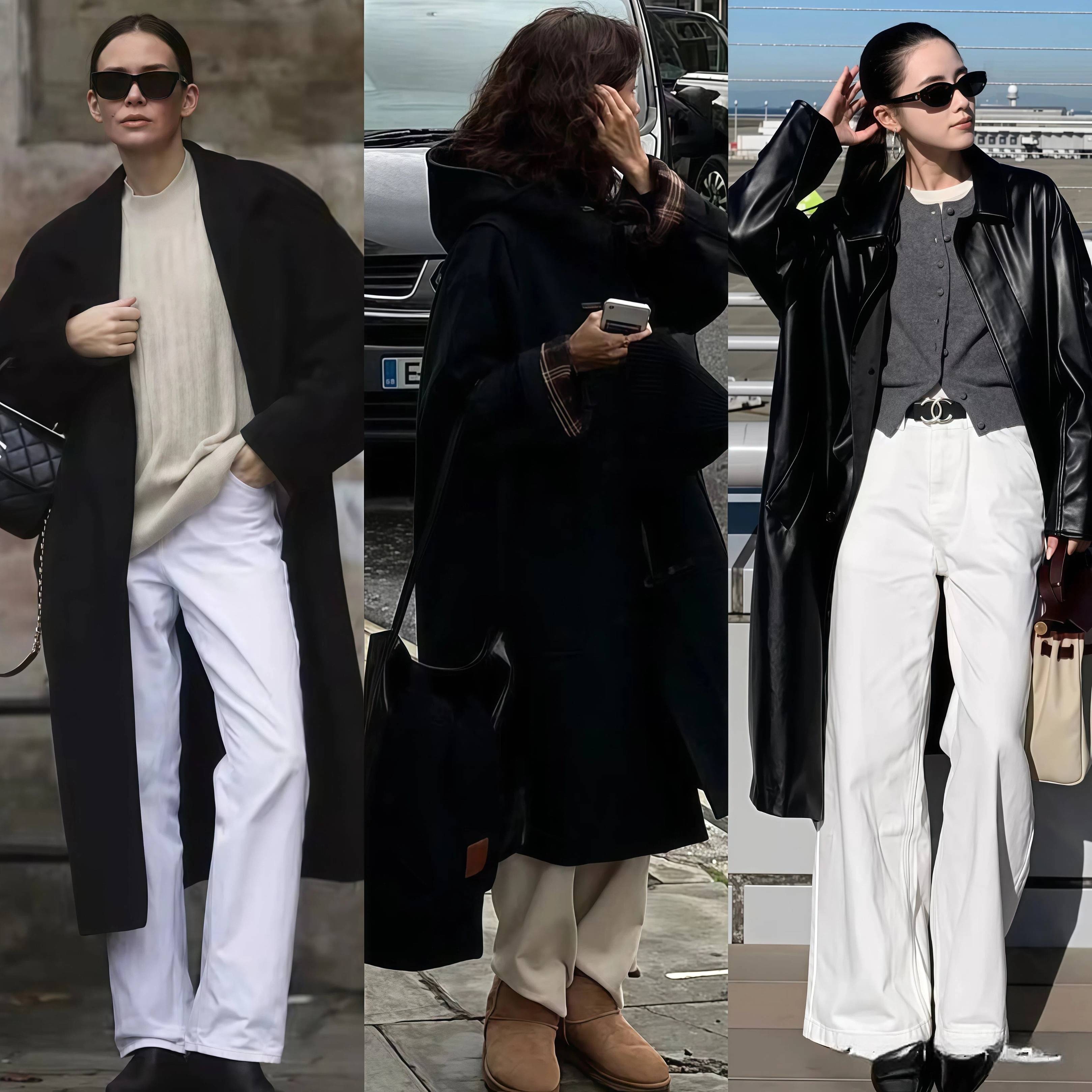 这个配色公式非常适合喜欢穿黑色、深灰、藏蓝等深色外套的女生,配上白裤子基本不会出错;内搭可以选浅色来过渡,比如米色或者浅灰色毛衣,让上下半身的颜色衔接看起来更自然。