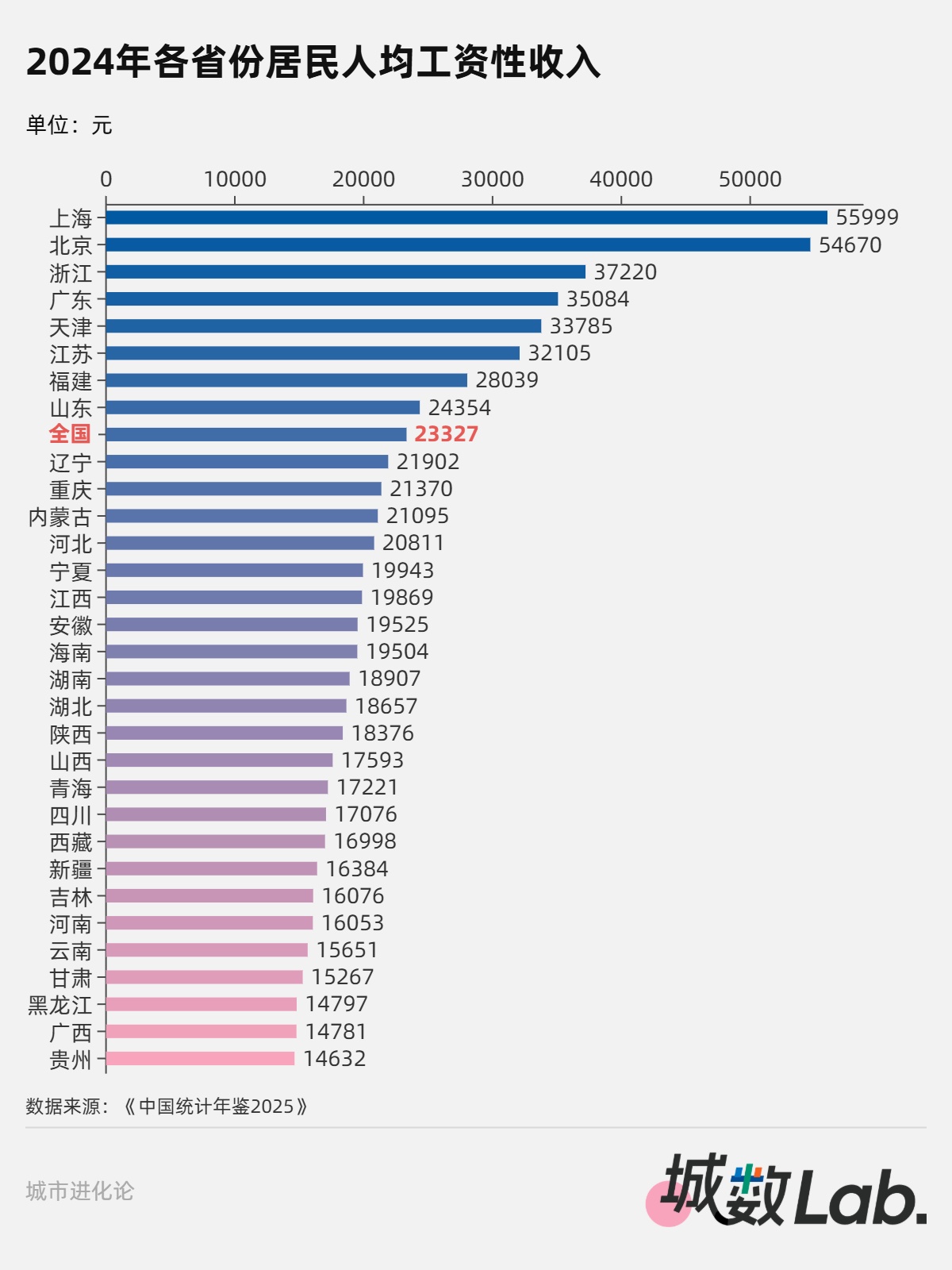 事实上,中国收入最低的省份,人均可支配收入已经被拉大到了仅为收入最高省份的30%(根据每日经济新闻报道,来自于国家统计局官网最新发布的《中国统计年鉴2025》)。