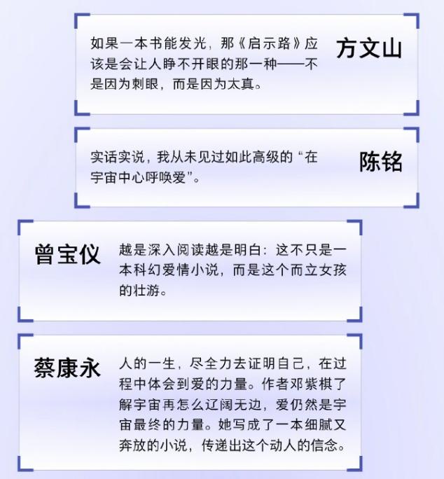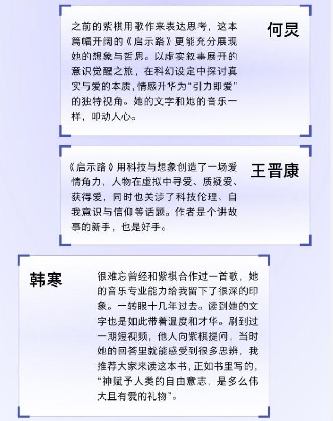小说内容摘要称,《启示路》是邓紫棋创作的首部长篇科幻小说。故事构建了三重世界结构元宇宙中的“乐土”与“废土”,以及真实世界。虚拟角色Gloria与现实中名为秋的女孩,在两个世界中各自挣扎、彼此照映。她们经历了身份的寻找与撕裂,也经历了情感的失落与重建。小说关注的并非科技本身,而是在技术介入人类生活后,个体面对“自我”与“爱”的复杂命题:我们该如何去爱。它并不提供答案而是提供一次通往内心的“启示之路”。