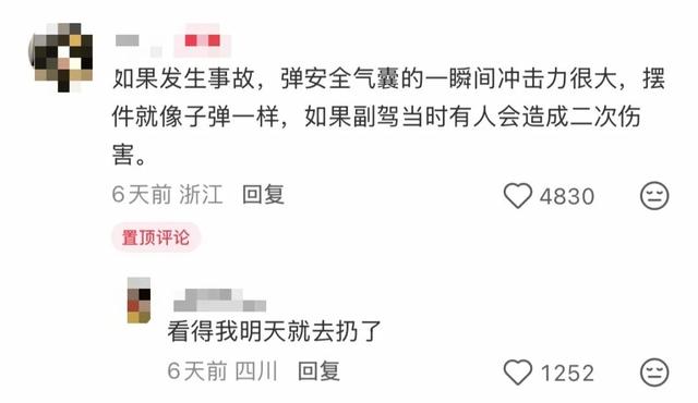 这位网友还在评论区补充说:如果发生事故,弹安全气囊的一瞬间冲击力很大,摆件会像子弹一样,给车里的人造成伤害。