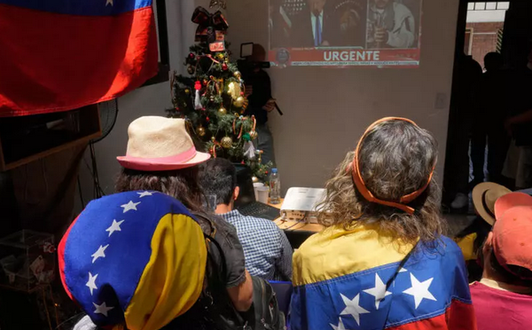 Des Vénézuéliens regardent en direct à la télévision le président américain Donald Trump s'exprimer lors d'une conférence de presse au sujet de la capture du président Nicolas Maduro, à Buenos Aires, en Argentine, le samedi 3 janvier 2026. AP - Natacha Pisarenko