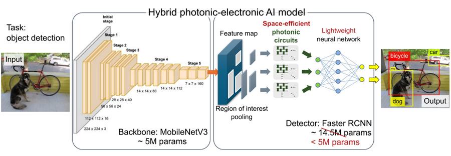 在严格证明规模定律改进的同时,李彦栋将这套剪枝策略应用到实际的光学神经网络中,设计了小型化的光子芯片模块,用于替换目标检测模型 Faster R-CNN 中的大规模矩阵运算。通过将这部分计算转移到光学模块,60% 以上的 GPU 侧参数被移除,显著减轻了 GPU 的计算负担。