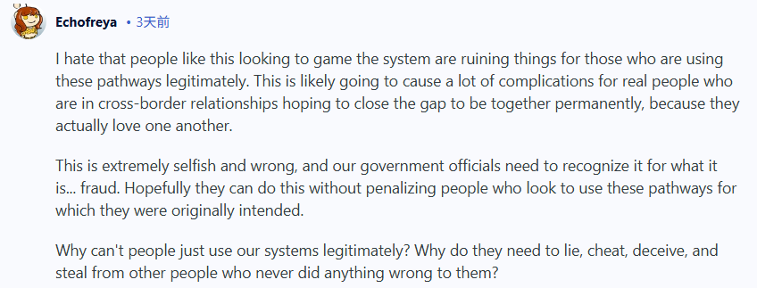 有网友将矛头指向制度滥用本身:“我痛恨这些钻空子的人,他们破坏那些合法使用这些途径的人的权益。这很可能会给那些真正相爱、希望跨越国界、永远在一起的跨国情侣带来诸多麻烦。这种做法极其自私,也完全错误,我们的政府官员必须认清它的本质——这就是欺诈。”