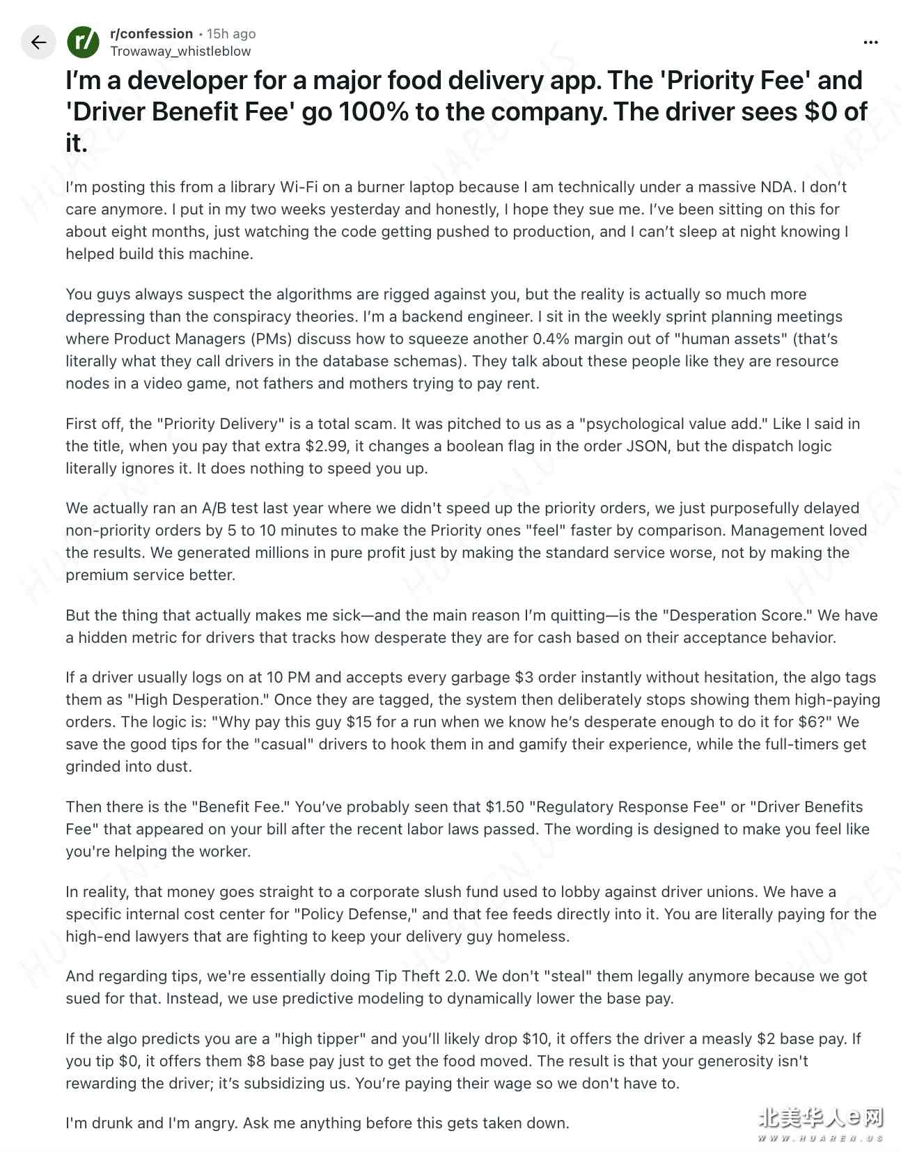 我是一家大型外卖应用的开发者。“优先配送费”和“司机福利费” 100% 都进了公司的腰包,司机一分钱也拿不到。 我现在躲在图书馆连着公用 Wi-Fi,用一台“一次性笔记本电脑”(Burner Laptop,指为了隐匿身份、用完即弃的廉价电脑)发这篇帖子,因为严格来说,我背着一份巨额的保密协议(NDA)。但我不在乎了。昨天我提了离职,说实话,我甚至希望他们来告我。这些秘密在我心里憋了八个月,眼看着那些代码被推上线(Production,指正式向用户开放的生产环境),一想到我亲手帮着造出了这台机器,我就整夜睡不着觉。 你们总觉得算法在针对你们,在搞鬼,其实真相远比阴谋论更让人压抑。我是个后端工程师。每周的冲刺规划会(Sprint Planning,敏捷开发中的周期性计划会议)我都得参加,听着那些产品经理(PM)讨论如何从“人力资产”(Human Assets)身上再榨出 0.4% 的利润——没错,数据库架构里真的是这么称呼司机的。他们谈论这些人时,就像在聊电子游戏里的资源采集点,完全忘了那是为了付房租而奔波的父亲和母亲。 首先,“优先配送”完全是个骗局。在内部宣传时,它被称为“心理附加值”。就像我在标题里说的,当你多付那 2.99 美元时,订单的 JSON 数据里确实有个布尔标记(Boolean flag,只有真或假两种状态的代码变量)变了,但派单逻辑(Dispatch Logic)完全无视它。它根本不会加快你的配送速度。 实际上,去年我们做过一次 A/B 测试(A/B Test,对比两种方案效果的测试方法)。我们没有加快优先订单的速度,而是故意把非优先订单延迟了 5 到 10 分钟,这样一对比,优先订单就“感觉”快了。管理层对结果满意得不得了。我们不需要提升服务质量,只需要把标准服务搞得更烂,就能凭空多赚几百万纯利润。 但真正让我作呕——也是我辞职的主要原因——是“绝望评分”(Desperation Score)。我们有一个针对司机的隐形指标,通过分析他们的接单行为,来追踪他们到底有多缺钱。 如果一个司机通常在晚上 10 点上线,并且毫不犹豫地秒接每一个只有 3 美元的垃圾订单,算法(Algo)就会给他打上“高度绝望”的标签。一旦被打上标签,系统就会故意不再给他们展示高价订单。逻辑很简单:“既然我们知道这人缺钱缺到 6 美元都肯干,干嘛要花 15 美元让他跑这一趟?”我们把小费丰厚的好单子留给那些“偶尔跑跑”的司机,以此把他们钓住,让他们的体验像玩游戏一样爽,而那些全职司机则被彻底榨干。 然后是“福利费”。在最近的劳动法通过后,你可能在账单上见过 1.50 美元的“监管应对费”或“司机福利费”。这种措辞就是为了让你觉得自己在帮助劳动者。 实际上,这笔钱直接进了一个企业的秘密基金,专门用来游说反对司机工会。我们在内部有一个专门的成本中心叫“政策防御”(Policy Defense),这笔费用就是直接输血给它的。说白了,你付的钱,其实是雇了顶级律师,去跟你的外卖小哥作对,让他们继续无家可归。 至于小费,我们基本上是在搞“偷小费 2.0 版”。我们现在不再通过法律上定义的“偷”来拿小费了,因为那样被起诉过。相反,我们利用预测建模(Predictive Modeling)来动态降低基础薪资。 如果算法预测你是个“豪爽的给小费者”,很可能会给 10 美元小费,系统就会只给司机区区 2 美元的基础运费。如果你不给小费,系统就会开出 8 美元的基础运费,只为了有人肯接单把饭送出去。结果就是,你的慷慨并没有奖励给司机,而是补贴了我们。你在帮我们给司机发工资,这样我们就不用掏钱了。 我喝高了,也很愤怒。在帖子被删之前,有什么想问的尽管问。