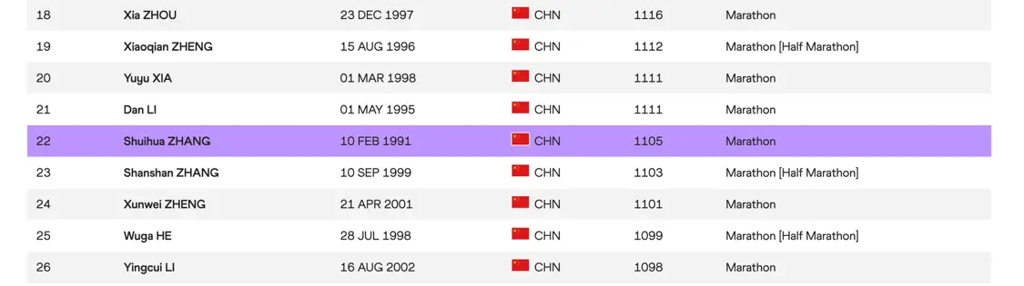 多家跑步自媒体统计的2025年女子马拉松选手成绩中,张水华以2:30:38的成绩排名第17,将大量职业马拉松选手甩在身后。在国际田联官网上中国女子马拉松2025年成绩排名中,张水华以1105的积分排名第22。