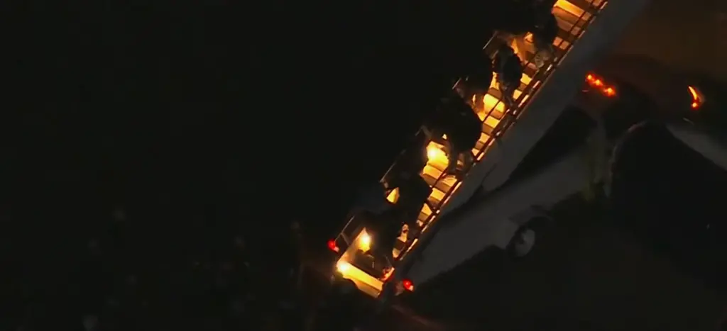 报道称,被押下舷梯的男子“似乎赤着脚……头部也被蒙住”。