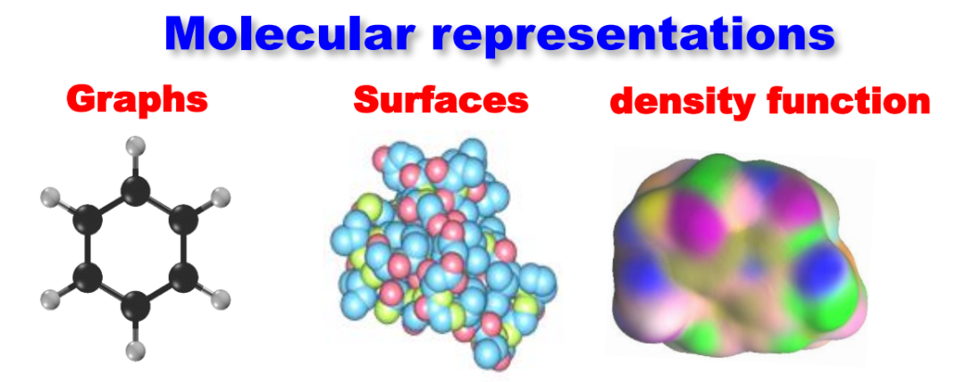 更进一步,还可以通过密度泛函理论来计算电子密度或电子函数分布,将分子数据转化为一种空间形态的数据表现形式。因此,尽管源自同样的分子数据,我们可以从多个角度对其进行表征。一旦完成表征,就可以在此基础上提取各种特性,包括各种指纹(fingerprint)和描述符(descriptor)等等。这些性质可能和最终想要理解的功能产生联系,例如水溶性、脂溶性、毒性等。