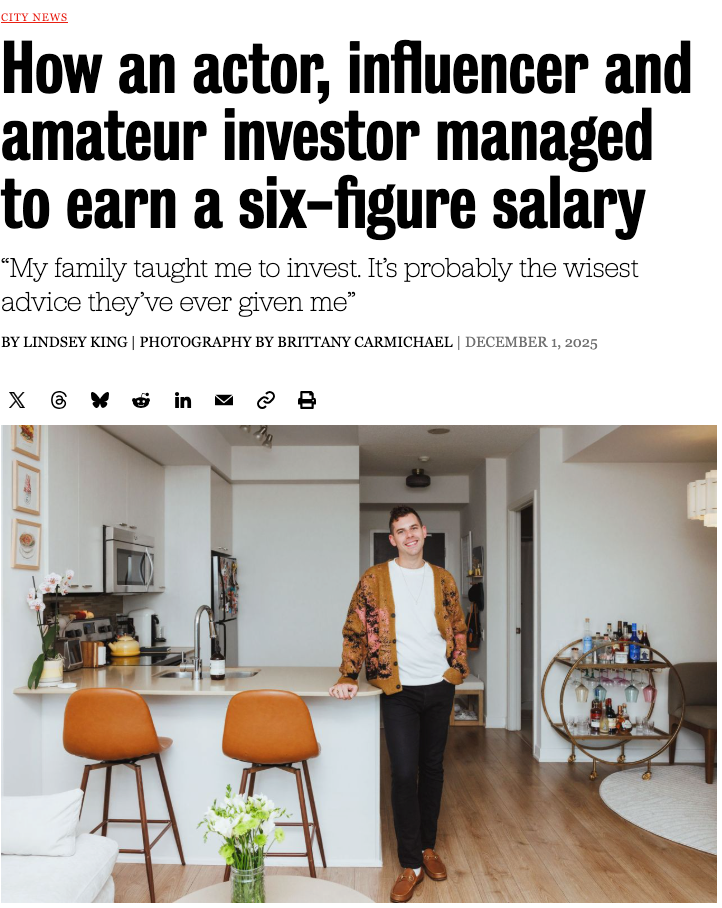 31岁男子 Jordan Shore 租住在多伦多市中心,是一位演员和网红,目前年赚23万加元,每月存2500,计划5年内买房,他最感恩是家人教会他投资。