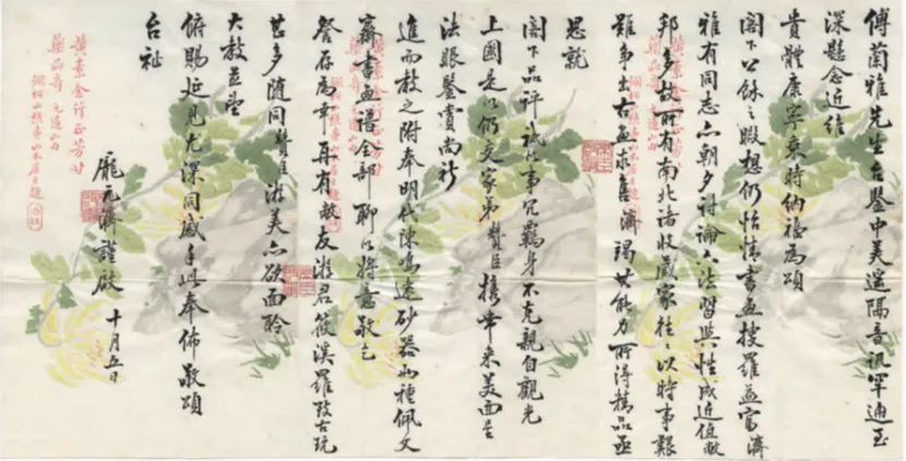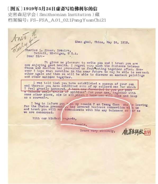 1910年代,庞元济与书画收藏家美国人佛利尔建立联系。根据佛利尔日记和佛利尔美术馆 1916 年 15幅画购买档案,庞赞臣两次赴美与佛利尔会面,一次在1915年4月29日,赞臣回国后,莱臣致信佛利尔“My cousin , some time ago brought my collection of paintings to your country for exhibition, and I almost feared that the picture might evoke your ridicules, but you were kind enough to take care of him and enlighten him as to movements which cements long separated friendship and for which I am extremely indebted.”在信中感谢佛利尔对其堂弟的照顾。第二次在1916年12月。1916年10月5日,庞赞臣赴美前,庞莱臣有一封给傅兰雅(佛利尔的中文名)的中文信:“傅兰雅先生台鉴:中美遥隔,音讯罕通,至深悬念。近维贵体康宁,乘时纳福为颂。阁下公余之暇,想仍怡情书画,搜罗益富。济雅有同志,亦朝夕讨论六法,习与性成。近值敝邦多故,所有南北诸收藏家,往往以时事艰难,争出古画求售,济竭其能力,所得精品,亟思就阁下品评。只以事冗羁身,不克亲自观光上国,是以仍交家弟赞臣携带来美,面呈法眼鉴赏,尚祈进而教之。附奉明代陈鸣远砂器两种,《佩文斋书画谱》全部,聊以将意,敬乞察存为幸。再有敝友游君筱溪,罗致古玩甚多,随同赞臣游美,亦欲面聆大教,并望俯赐延见,尤深同感。手此奉布,敬颂台祉。庞元济谨启。十月五日。”(该信现藏佛利尔美术馆档案室,图片来自徐莺《佛利尔与庞元济的中国艺术品——基于书信与购藏档案的藏品流通分析》,《艺术图像学研究 第1辑》。文字标点只有一处更改,其余皆同徐莺原文。以上佛利尔美术馆相关档案的信息皆来源于徐莺本文及徐莺、邱伟云:《虚斋与佛利尔的中国画收藏——基于图录与画名的N-gram藏品分析》,《故宫博物院院刊》2021年第5期。其来源清晰可查,可见徐莺为庞元济研究是付出了不少心力,做出了贡献的。)
