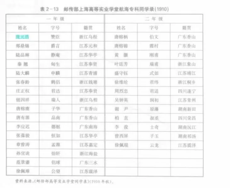 据《邮传部高等实业学堂同学录》,庞元浩1910年秋转入航海专科。