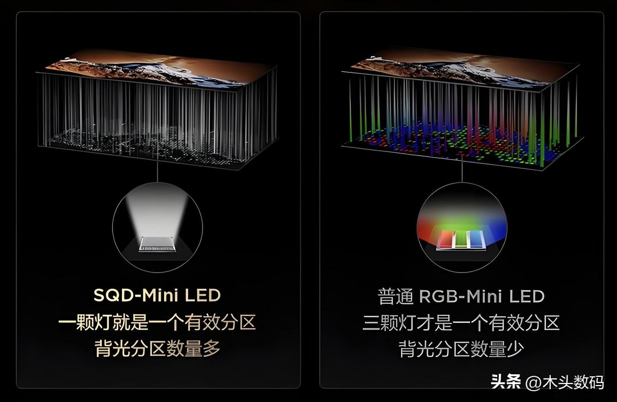 具体来看,相较于市面上普通RGB-Mini LED技术,SQD-Mini LED的优势堪称“降维打击”,核心差异就在于控光分区的实现逻辑。RGB-Mini LED需要三颗不同颜色的灯珠组合,才能形成一个有效的物理背光分区;而SQD技术做到了“一颗灯珠就是一个独立分区”,相当于在同等成本下,控光能力较RGB-Mini LED直接翻了三倍,细节还原精度大幅提升。