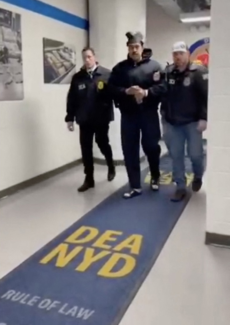 根据白宫在X的官方帐号Rapid Response 47发布的影片显示,马杜罗身穿一件黑色连帽衣,两手被上铐,在多名美国缉毒局干员的护送下,缓步走过铺有蓝色地毯的走廊,地毯上清楚标示“缉毒局纽约分局”(DEA NYD)。 这篇贴文并讽刺写到:“犯人游街。”(Perp walked.)