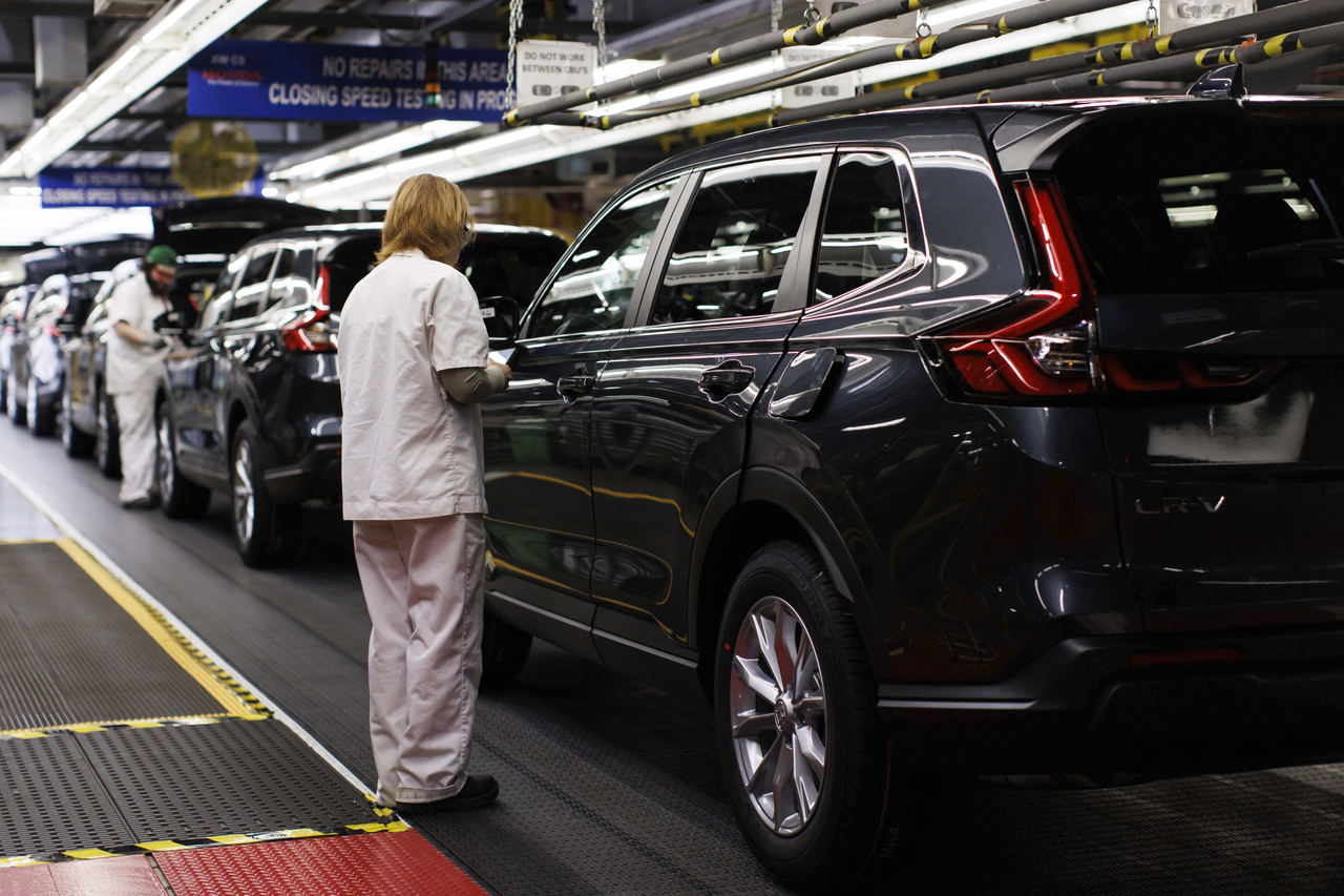 在多年供应吃紧后,CR-V库存明显回升,往往对二手价格形成压力。图为CRV北美生产线。 (美联社)