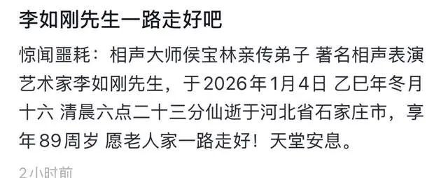 1月4号,相声圈突然传出悲痛噩耗,曾在今年一月份现身的知名相声演员李如刚不幸去世,享年89周岁。