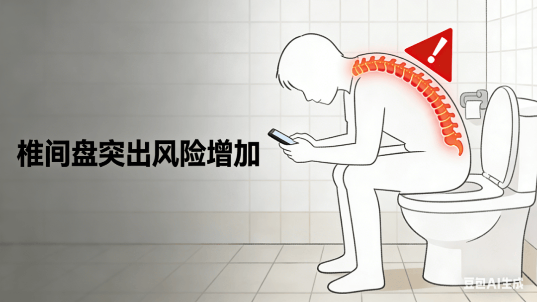 如厕时,身体会不自觉地前倾,颈椎受到的压力倍增,导致颈椎前屈度发生变化,易引起颈椎间盘突出、颈椎不稳等。尤其是蹲便时,腰椎缺乏足够支撑,椎间盘所受重力不断增大,久而久之可能诱发腰椎间盘突出。