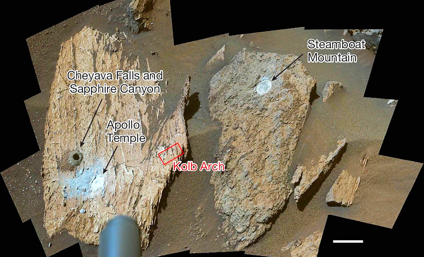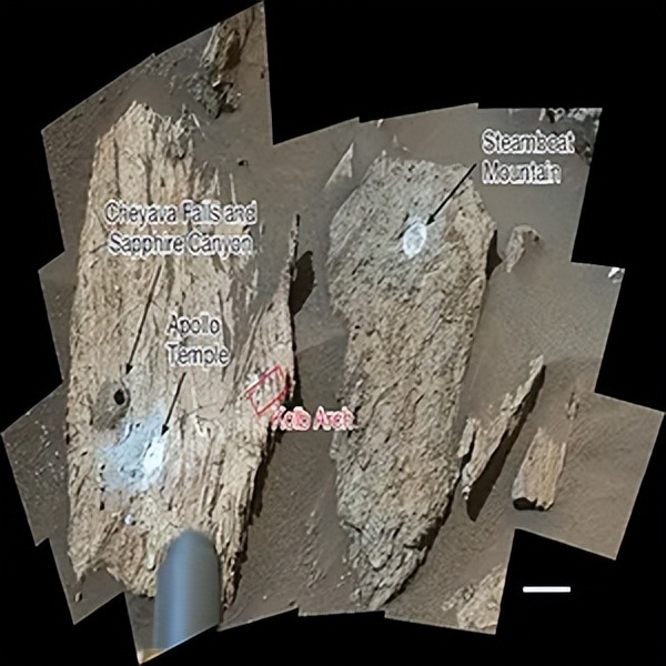 这块浅色层状岩体包含了切亚瓦瀑布的天然地表目标、阿波罗神庙的磨蚀痕迹以及蓝宝石峡谷岩芯样本的采集位置。图片来源:《自然》杂志。