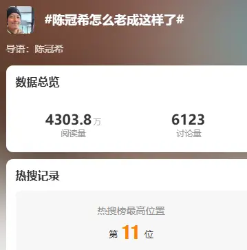 1月4日,有网友分享了一张在滑雪场偶遇陈冠希的照片,照片中的陈冠希面露微笑,眼角和眉心皱纹较为明显,依稀还能看到一些白色的胡须。 年轻时的陈冠希一直以“痞帅”形象著称,因为该照片和他年轻时相比变化太大,有不少网友看到后惊呼“完全认不出”,词条“陈冠希怎么老成这样了”也因此登上微博热搜榜。 公开资料显示,陈冠希出生于1980年10月7日,目前还未满46岁。他的代表作有《无间道》《头文字D》等。