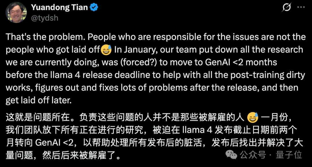 因为上头的压力,全组被迫放下手头正在做的工作,来Llama 4接烂摊子,距离发布ddl就剩2个月,还要处理所有dirty work。