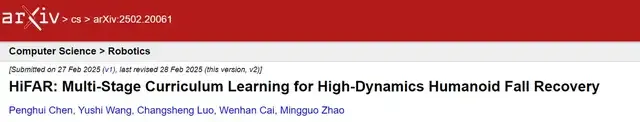 在这篇论文中,他和其他作者介绍了一个多阶段课程学习框架HiFAR。这一框架采用分阶段学习方式,通过引入一个会逐渐变得复杂的高维恢复任务,能够促进机器人学习到高效稳定的摔倒恢复策略,并能让机器人通过调整其策略,以便能够有效处理现实世界的摔倒事件。这一成果已经在真实类人机器人得到了有效验证,比如可以让机器人从容应对多种摔倒姿态等。(论文链接https://arxiv.org/abs/2502.20061)