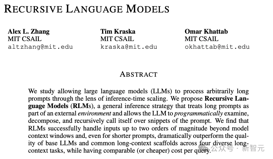 这篇论文叫《Recursive Language Models》,也就是递归语言模型。