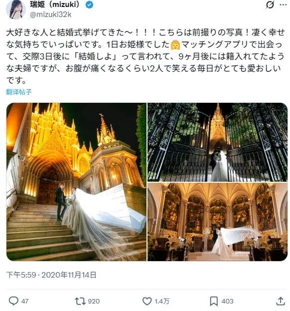 日本妹子瑞姫(mizuki)曾在2020年11月14日,在社交平台上分享了几张自己跟丈夫拍摄的婚纱照。