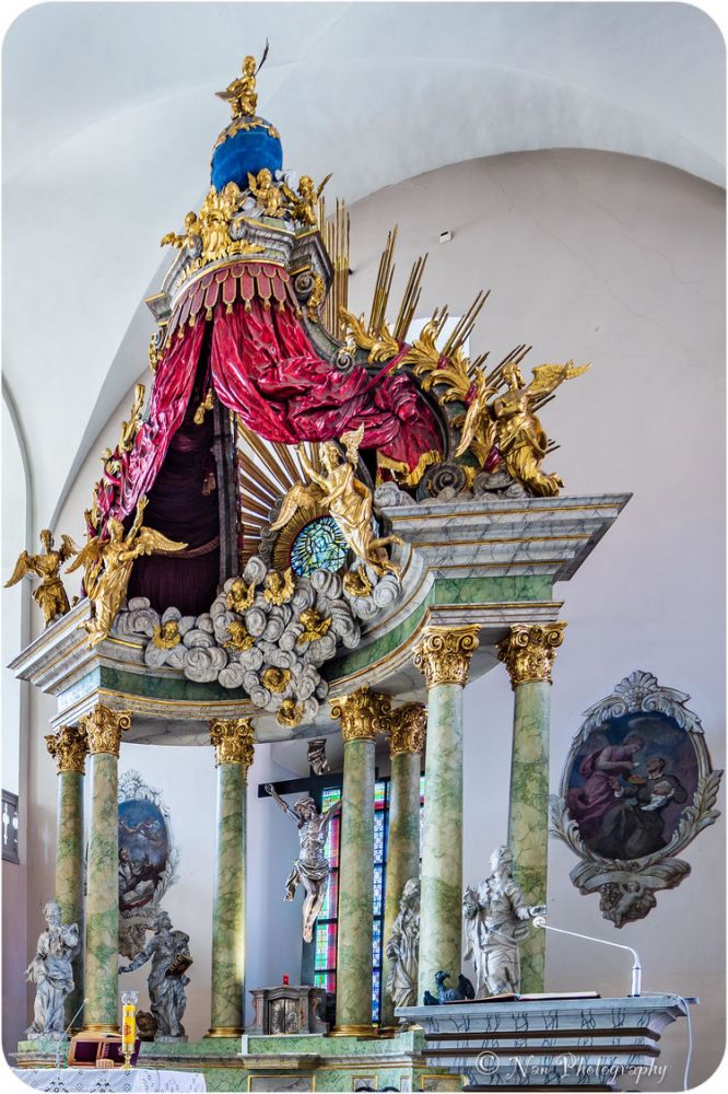 教堂里唯一华丽之处,是这座巴洛克主祭坛,祭坛右侧是波兰国王齐格蒙特三世的姐姐 - 瑞典公主安娜 瓦萨(Anna Vasa)的陵墓。