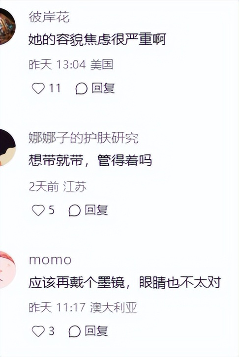 有人说她戴口罩就是因为容貌焦虑了,否则出席公开活动还遮遮挡挡,这在礼仪上很不礼貌。