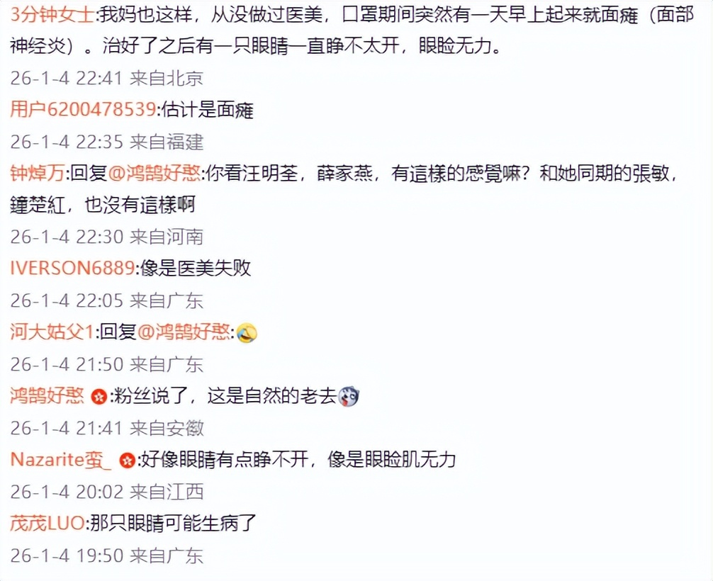 有人称这种现象为“眼睑肌无力”,更有人解释称王祖贤左眼的状况与其母亲的经历相似:从未做过医美,但突然之间就患上了面部神经炎,也就是我们常说的面瘫。