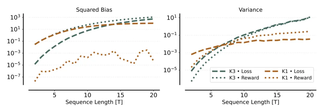 〓 图2. 极简自回归模型下各估算器的梯度偏差(左)与方差(右)。K1 in Reward(点线)的偏差接近于 0,而 K3 in Loss(虚线)存在显著的偏差。