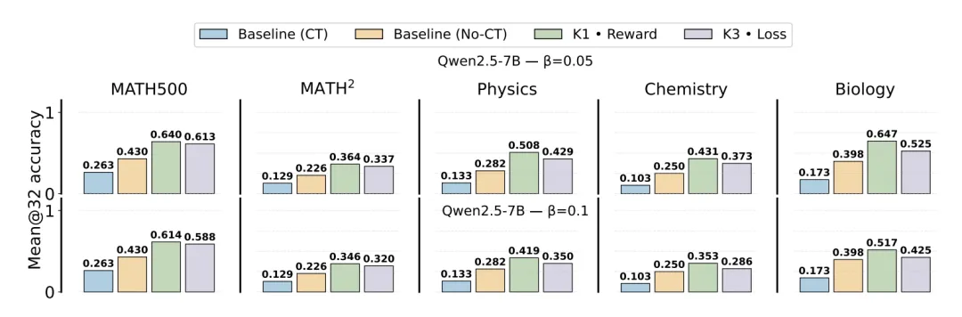 〓 图4. Qwen2.5-7B 在不同 KL 配置下的性能对比。浅绿色 (K1 in Reward) 代表无偏方案,灰色 (K3 in Loss) 代表主流有偏方案。